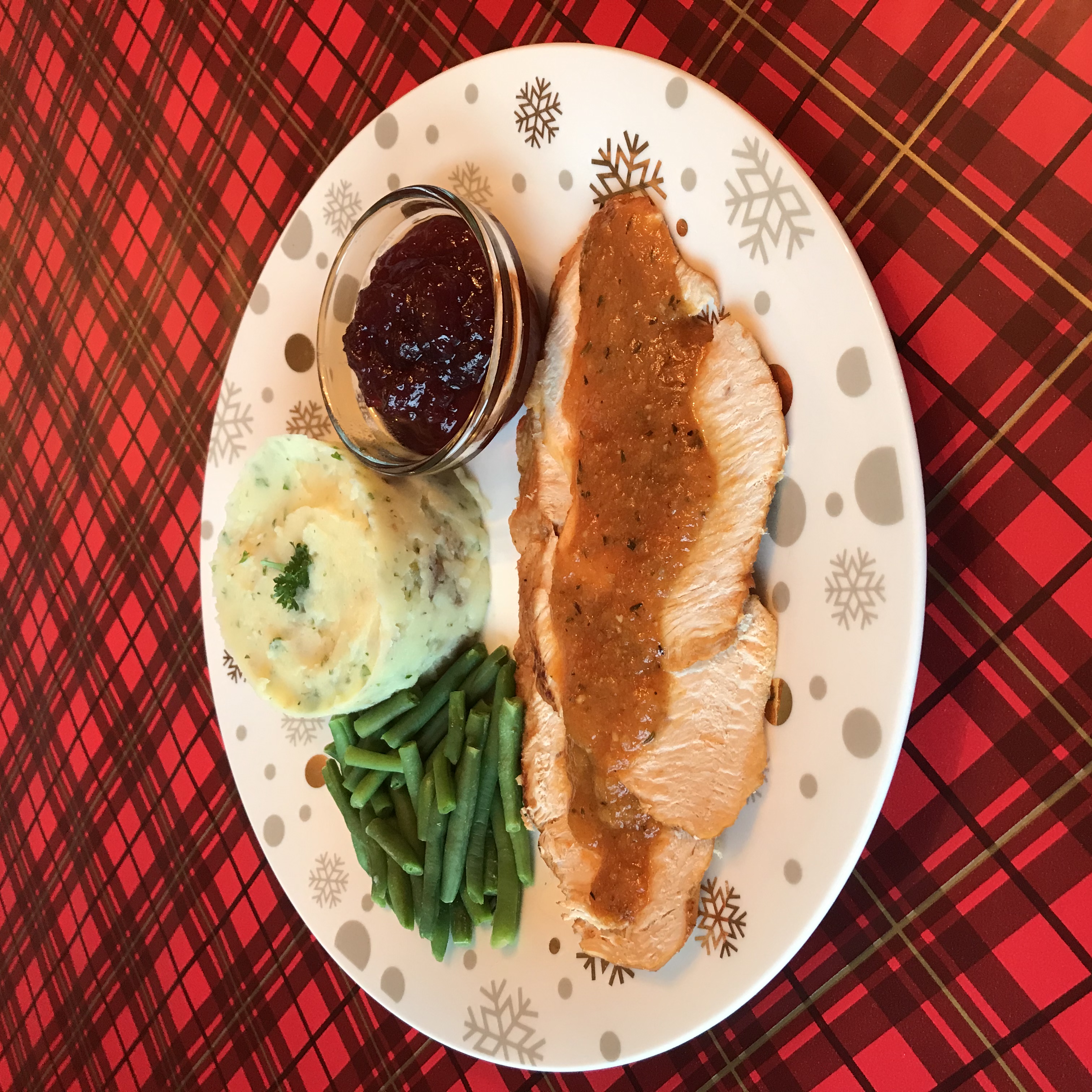 Poitrines de dinde accompagnées de purée de pommes de terre rustique et sauce aux canneberges